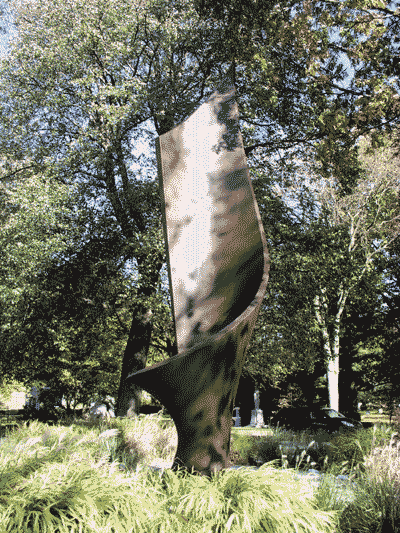 The Willow Pond Knoll Sculptureby Richard Ducas (above) is installed in Mount Auburn Cemetery. In 2006, scaffolding was erected (above left) and the sculpture's surface was carefully scraped down, recoated and waxed for protection. The photograph on the right is the same sculpture after treatment.
