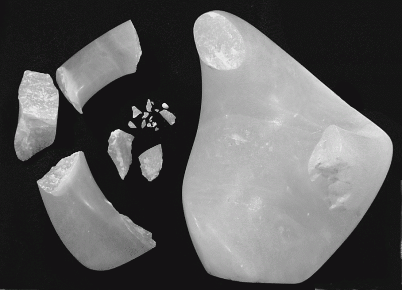 On a smaller scale, this sculpture by Carlos Melitos, entitled Embrace was accidentally broken into several large pieces and a number of tiny fragments. The owner was careful to keep all the small chips together. This facilitated the nearly invisible final repair. KEEP THOSE FRAGMENTS PLEASE!