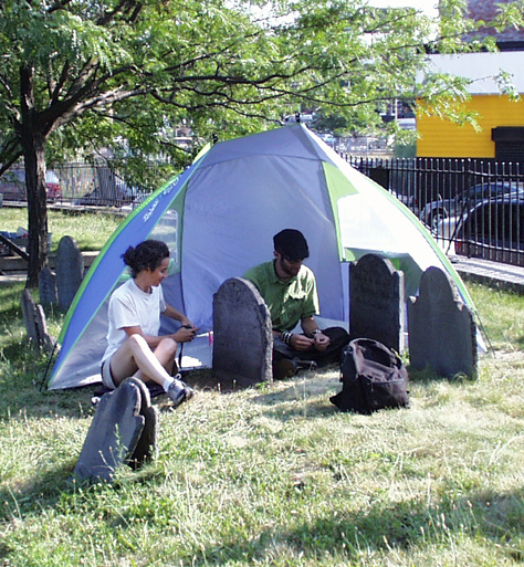 Below, Assistants Salvatore and Krefetz aid in the conservation of historic grave markers at the Eliot Burying Ground in Boston, Mass.